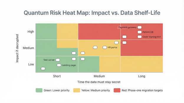 The red corner, containing long shelf-life and high-impact data, shows the first movers of our migration. Typical residents include payment gateways, patient databases, code-signing roots, and cross-border VPNs. The Canadian government framework uses the same color-coded lens to ensure “systems protecting long-lived sensitive information are prioritized early.”