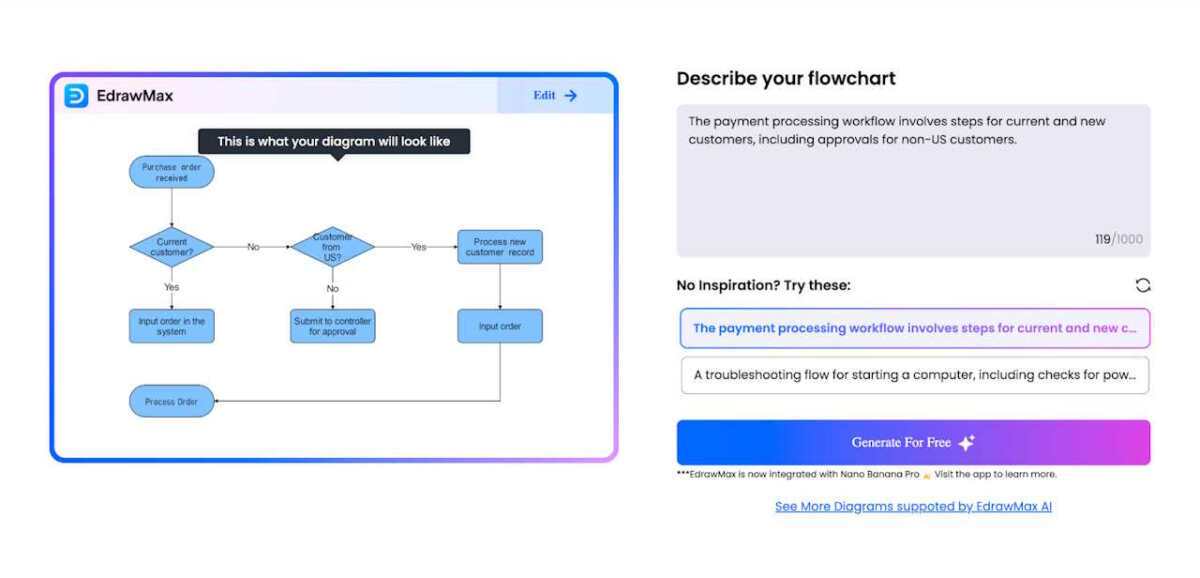 Users can enter a written description of a workflow, and the AI builds a clear, editable flowchart. Diagrams can then be refined, reorganized, and shared. It works well for generating approval flows, onboarding systems, support processes, and compliance documentation.