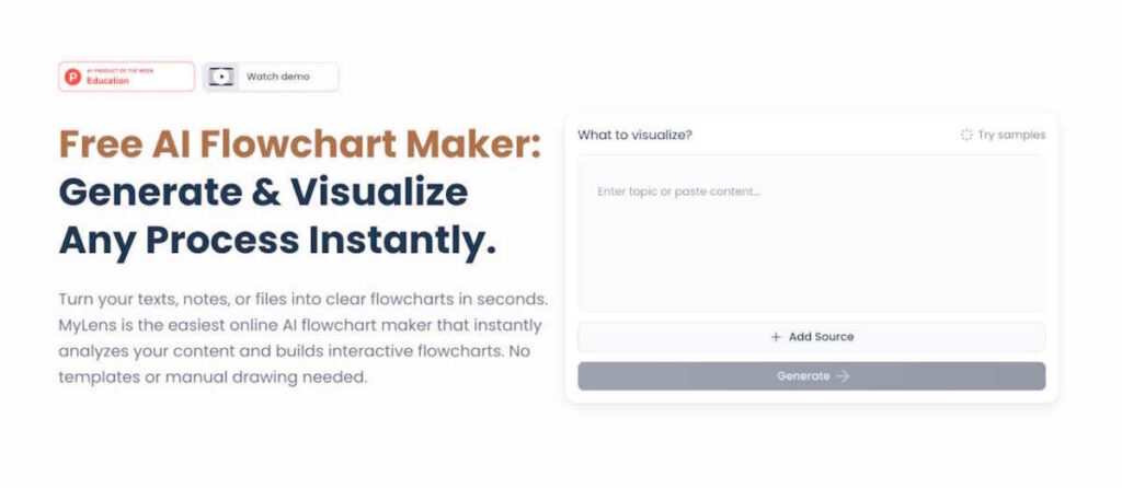 MyLens AI Flowchart Maker is a browser-based tool designed for users who need quick generation in 2026. Users enter text and receive a flowchart instantly.