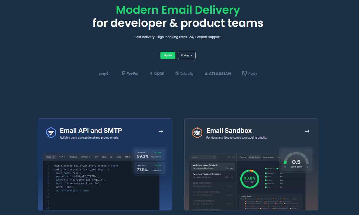 | Mailtrap | High deliverability | Node.js, Ruby, PHP, Python, .NET, Elixir, Java | $15/month | 4.8/5 |